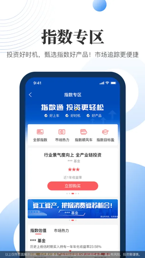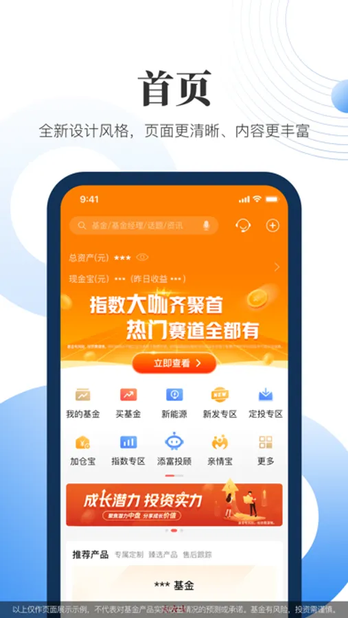 * 产品线丰富:从货币基金、债券基金、指数基金到混合型和股票基金,业内基金品种全覆盖,满足您不同理财需求;