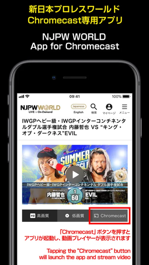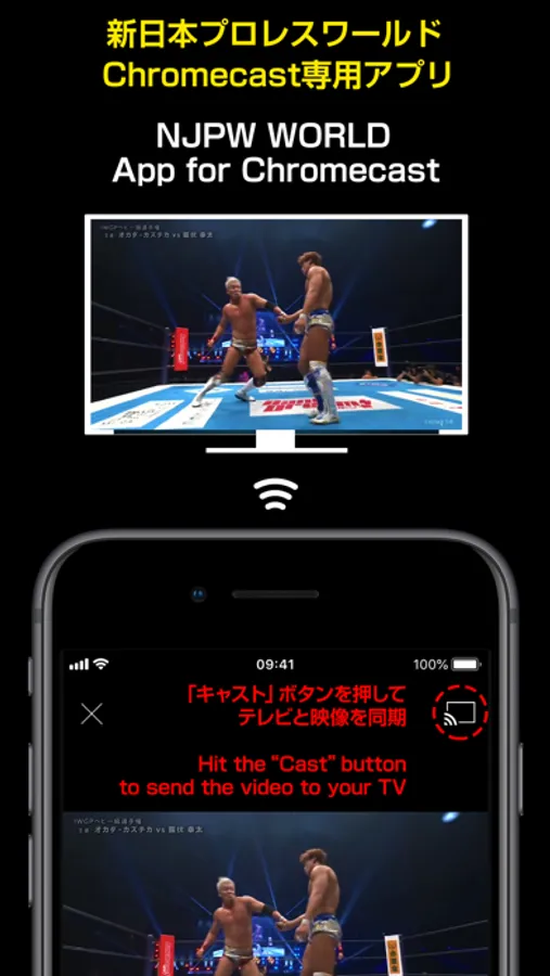 With the app, you will be able to stream NJPW World content to your television via a Chromecast.