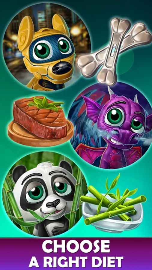 No matter whether you used to play pet simulator games as a child, or you ever had a real pet, you understand the importance of proper food for your furry friend. In this puzzle game the choice of food makes all the difference. The choice of diet determines whether you will raise a rodent or a predator, a sea dweller or a bird. For example, a future panda will enjoy bamboo leaves, while a lion would prefer a steak for breakfast. If you are not sure how to feed and grow fish, purchase a diet from the book and stick it to the fridge. If you want to unlock all virtual animals, don’t hesitate to use the option. New species are added with updates, including robopets and fantastic beasts. There be dragons (and unicorns too)!