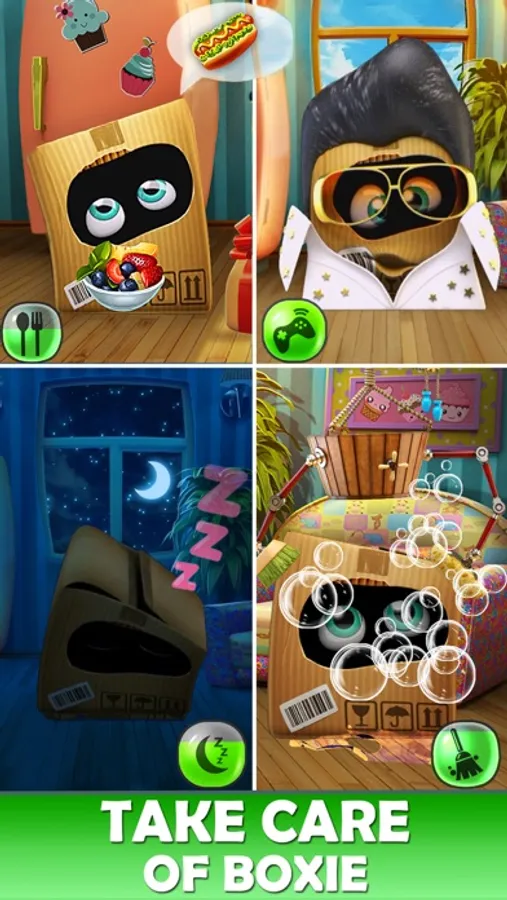 When you play animal care games, you know that it’s not only about playing and feeding. Watch the broom meter, as Boxie needs washing from time to time. In case the crescent meter goes low, your little friend wants to sleep. Switch to night time to let him take a nap.