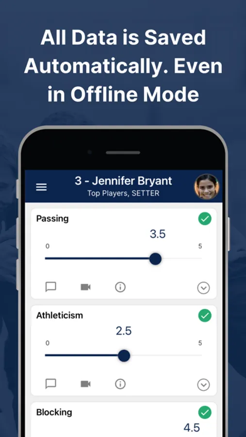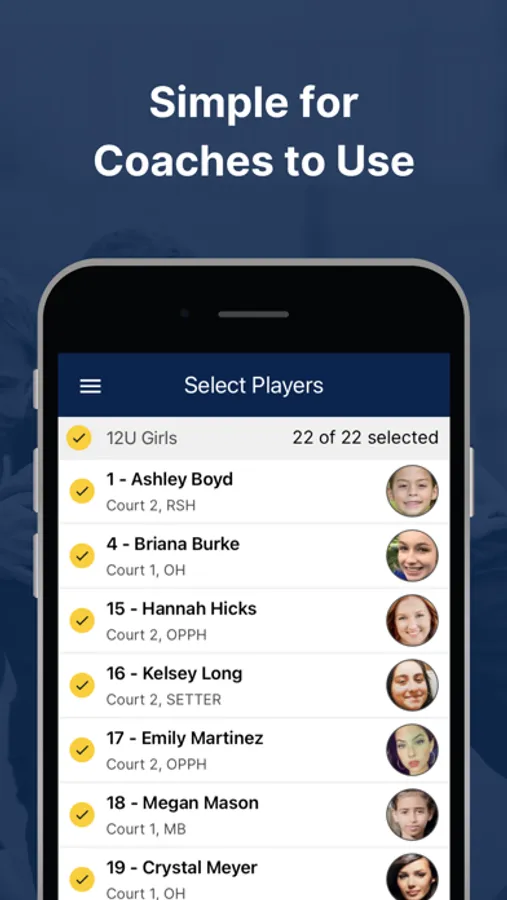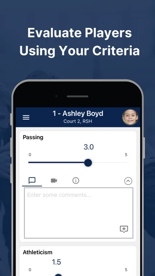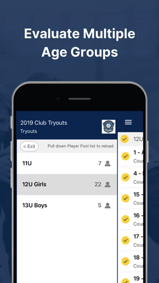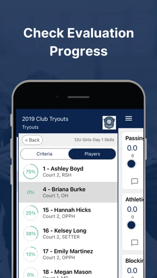 Set up an evaluation through the TeamGenius web application. Coaches then download the TeamGenius mobile app, enter an assessment specific access key, and start evaluating. All data is synced to your account web portal immediately where admins/directors can analyze results, view player rankings, form teams, share valuable feedback, and more.