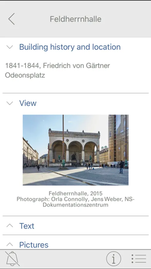 The application makes four suggestions for routes through Munich's inner city. These one- to two-hour tours guide users to important places for the history of National Socialism in Munich. The selected route is automatically displayed on the map. The POIs along the route are marked. With activated GPS, the current location is displayed on the map.