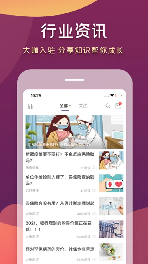 知识、产品、案例等保险知识,全方位获取保险市场动向、细数保险产品优劣、倾听保险大咖成长历程、学习保险知识。