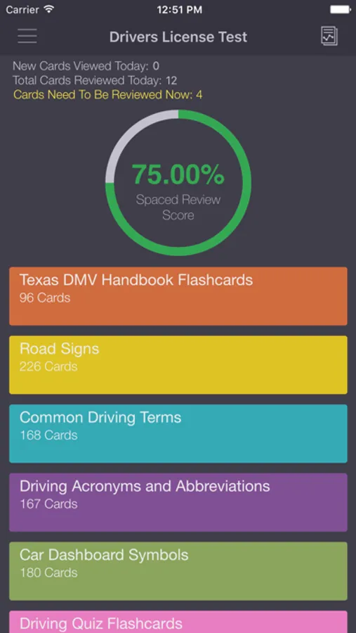 Texas DMV Drivers License Handbook Test & Study Flashcards App is the Most Complete Texas Drivers License Test Preparation App on the market. This application has tons of content and it also integrates the principle of Spaced Repetition to help drivers retain a large amount of knowledge in their long term memory.