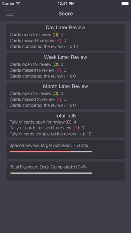 ● Spaced Review Score – Instant updating score system based on spaced review target achieved or missed.
