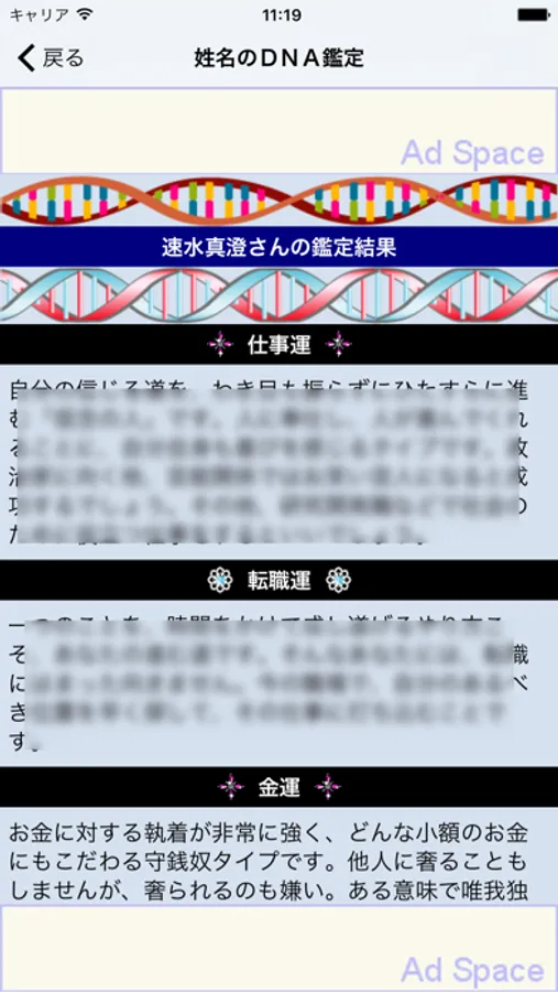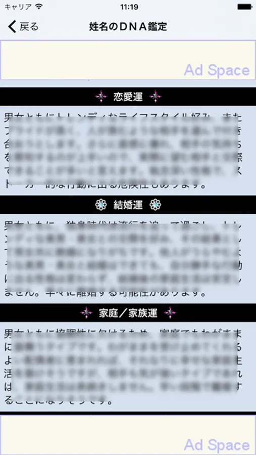 姓名判断により、仕事運、健康運、転職運、金運、恋愛運、結婚運、家庭運等を表示。