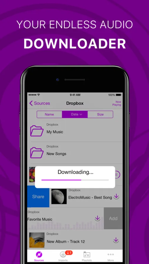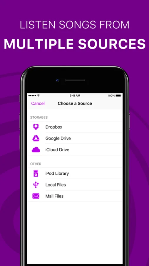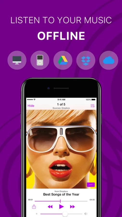 Access your favorite music across all your devices: iPhone, iPad, iPod library, Dropbox, Google Drive and your PC/Mac.