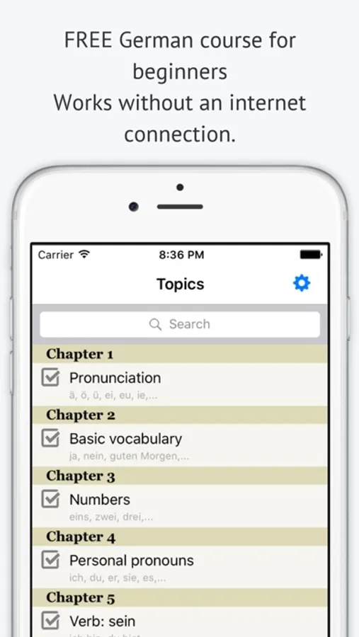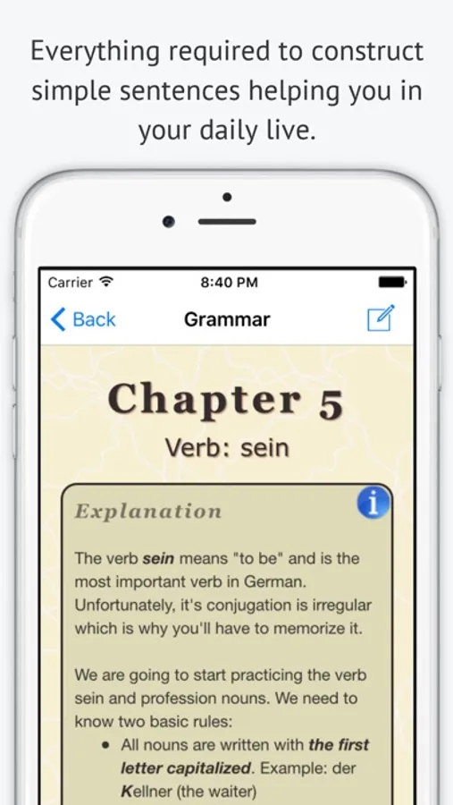 This FREE German course for beginners (100% offline) consists of several lectures. Each lecture contains some grammar, some basic vocabulary and many exercises. Learning German is more than just learning individual phrases by heart. You also need to be acquainted with the minimum grammar. Also it is crucial to know that most simple verbs to construct simple sentences. This App will help you to get to first level of German (A1) according the common European reference (MRER).