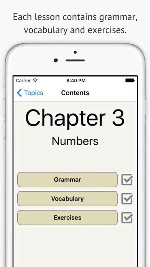 ◉ Each lesson contains grammar, vocabulary and exercises.