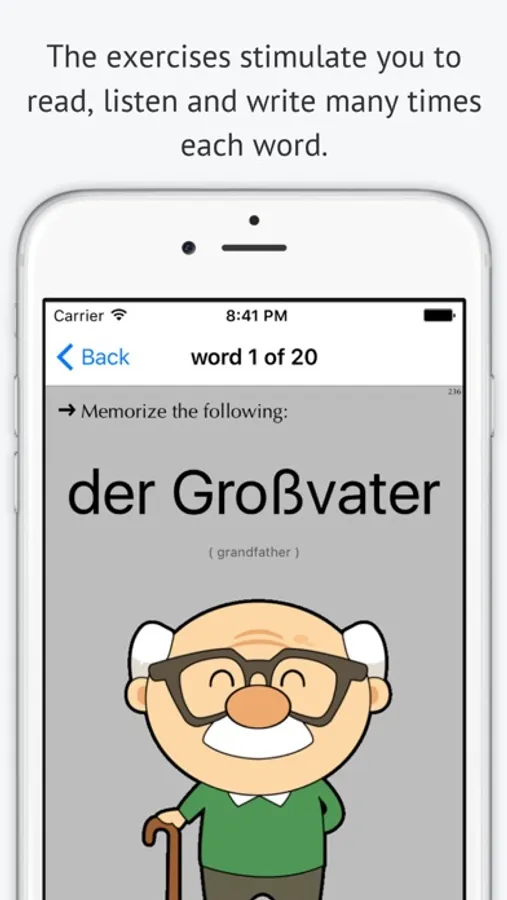 Thanks to thousands of exercises, almost 7000, you can learn the 500 words of basic vocabulary. The exercises stimulate you to read, listen and write many times each word. You will learn the numbers, the weekdays, the time, the conjugation of the verb "sein" (to be) and everything required to construct simple sentences helping you in your daily live.