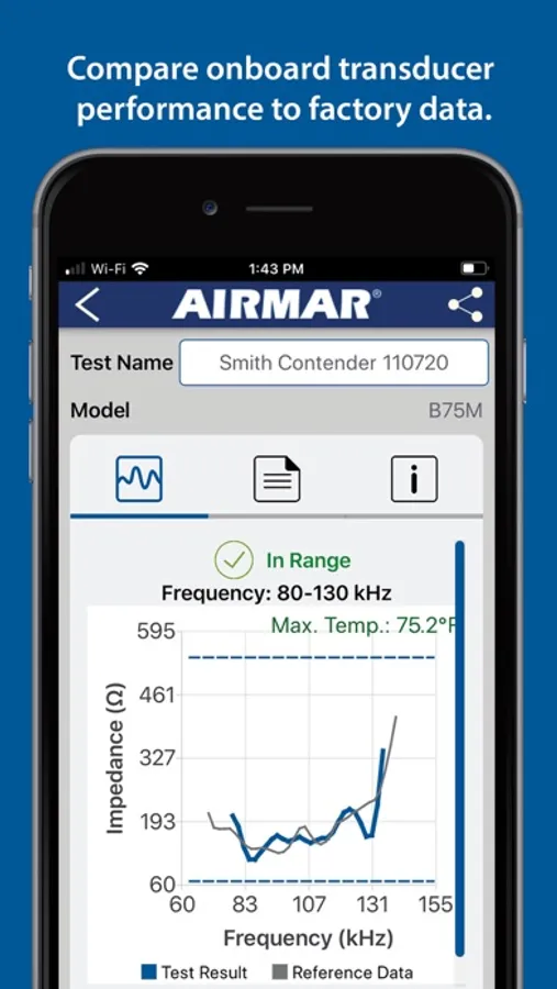 The AIRMAR SensorCheck™ App, paired with the TDT1000 Transducer Diagnostic Tester, compares the performance of a transducer in the field to its original AIRMAR factory specifications.