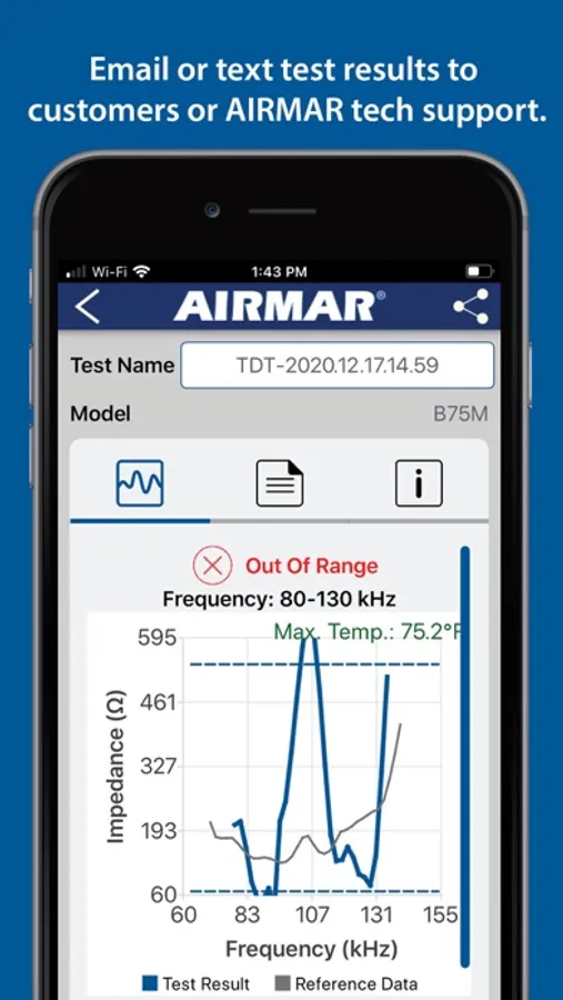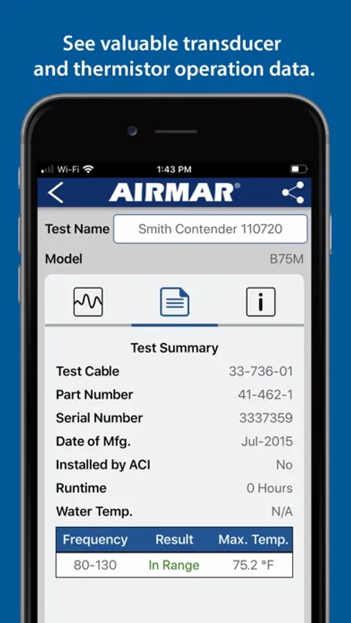 When the test is complete, an IN RANGE or OUT OF RANGE determination is made and test reports are automatically generated. Results can be emailed or texted directly to the boat owner or an AIRMAR technician. SensorCheck™ enables technicians to automatically submit warranty information to AIRMAR.