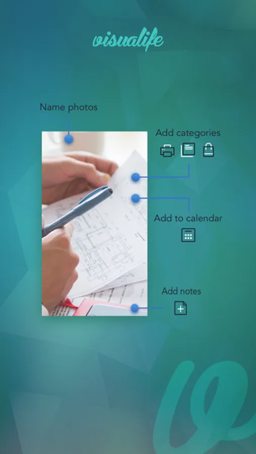 Visualife changes that and offers functions to organize, protect and add information to your photos. It offers categories, tags, comments, alerts and multiple import and share capabilities in order for you to keep a good track of your documents, instant findings, photo to-do lists, photo reminders, special access codes or other important information.
