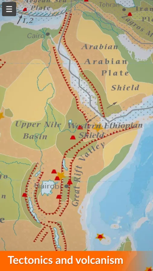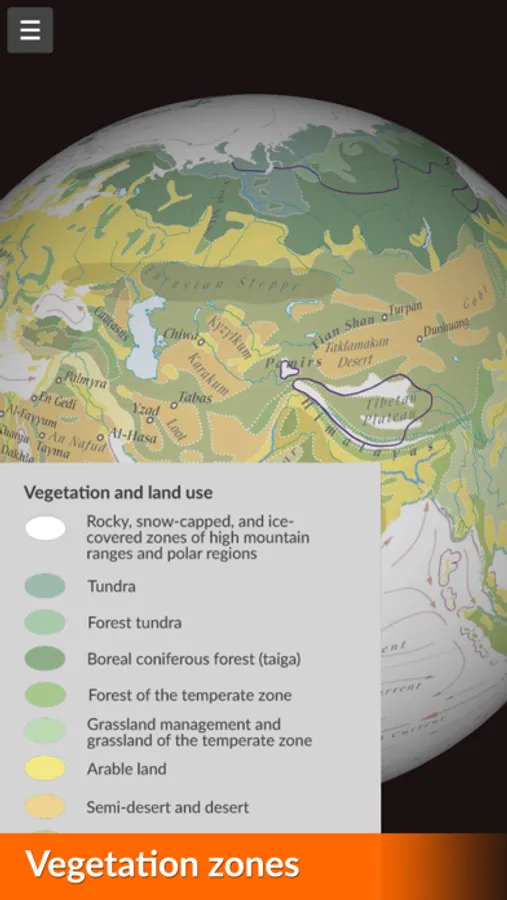 • Theme maps illustrating the relief, tectonics, and volcanism; vegetation; climate zones, marine currents, wind systems