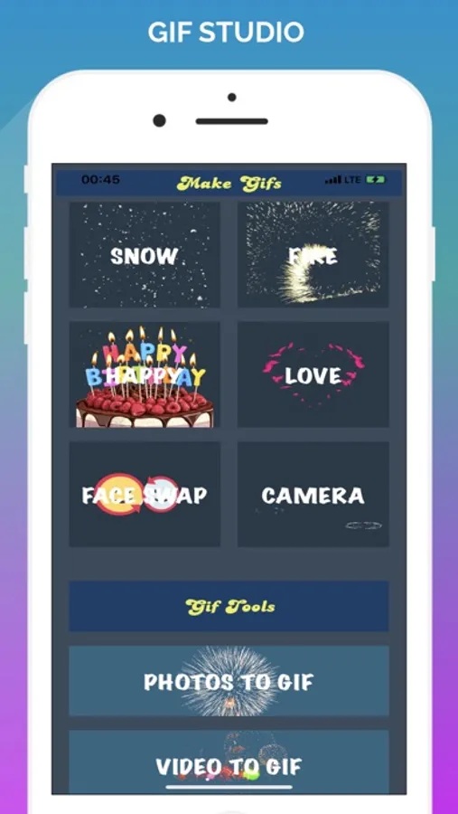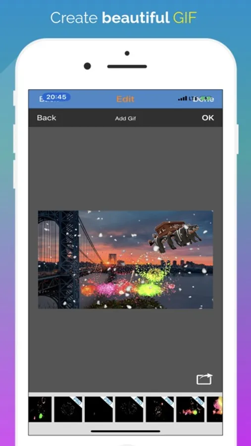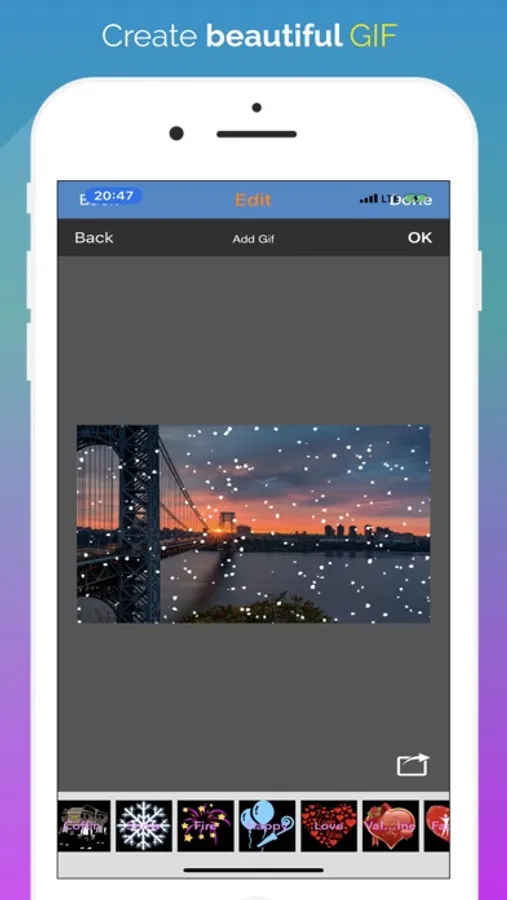 Add animated gifs to your photos with GifStudio. Customize your gifs by changing: filter, effect, blend, distortion, opacity, size, and even masking out areas of the gif for another level of creativity. When finished you can save as a gif, and share Gif (Post to Face, Messager, iMessages, insta, Send SMS ... )