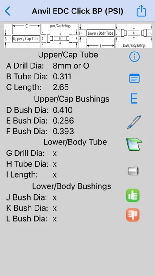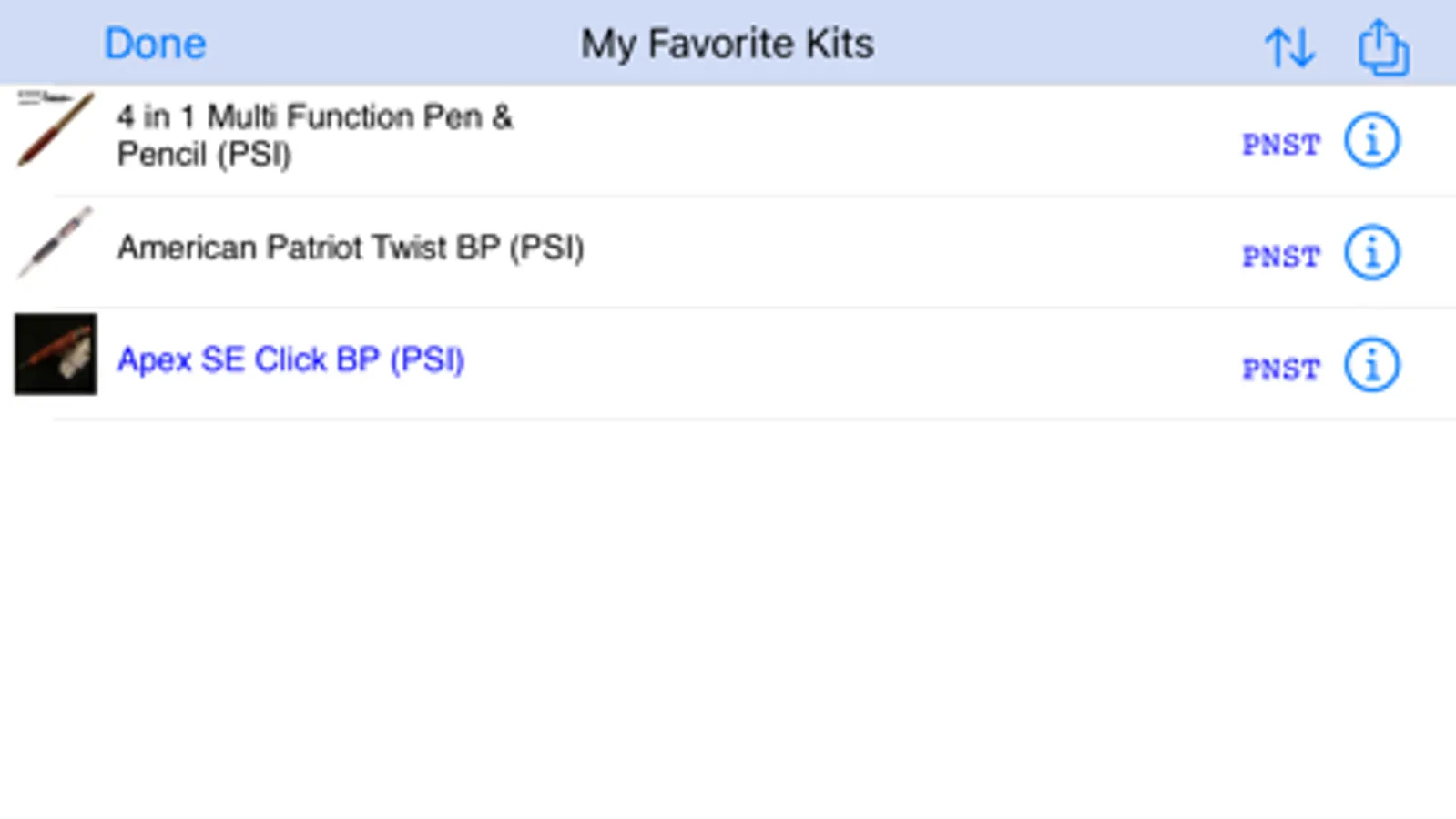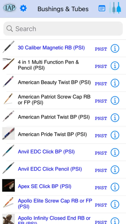 The IAP Bushings & Tubes app provides a searchable and sortable interface to over 4000 pen kits from most of the major kit suppliers. The app displays detailed tube and bushing specifications and drill bit requirements for every kit in the app database. These kit details can be emailed or printed via Air Print. You can create a favorites list of your most frequently used kits for faster access to those kits rather than searching through the entire app database every time you need to reference those kits. You can also reorder the database by your preferred supplier order.