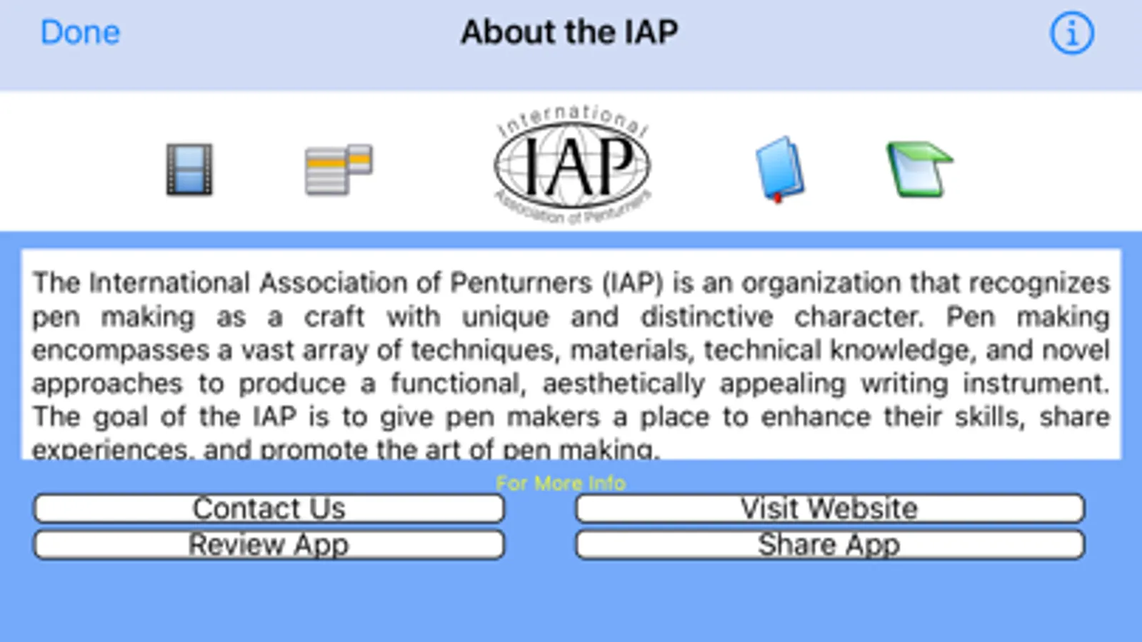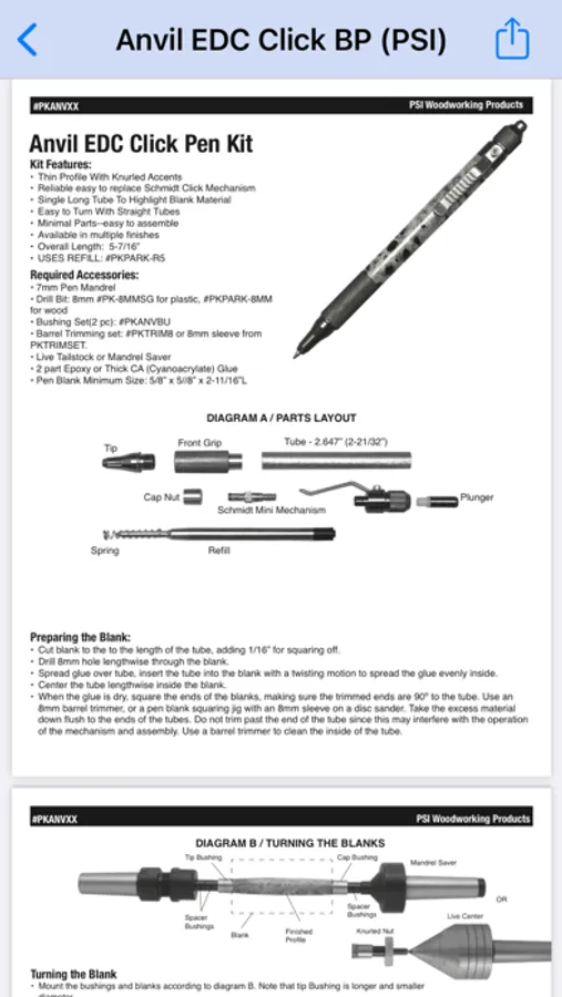 The app also contains several lists of useful references: Worldwide Suppliers of pen kits with links to take you directly to their web site; Helpful Penturning videos with links that will take you directly to the video; and Penturning Tutorials with links that will download the tutorial to your device for viewing in the app or to email or print.