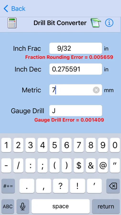 The app also includes a drill bit converter for converting between inch fractional, inch decimal, metric and gauge drill sizes. Conversions to inch fractional are made to the nearest 1/64" and conversions to gauge drill size are made to the nearest gauge drill size (107-1 and A-Z). An error factor is displayed for inexact conversions to inch fractional and gauge drill size.