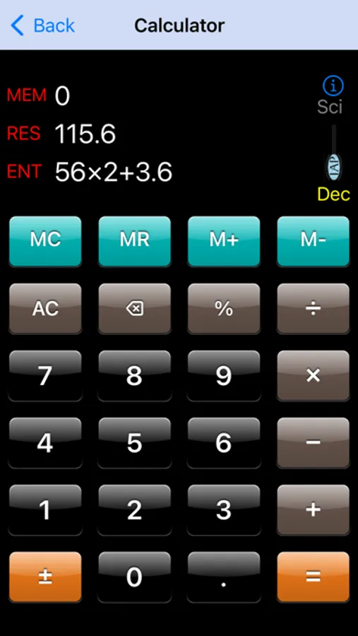 A 30-digit, 4-function calculator is included in the app. It has several advanced features not found in many simple calculators including a memory cell and the ability to display data in decimal or scientific notation.