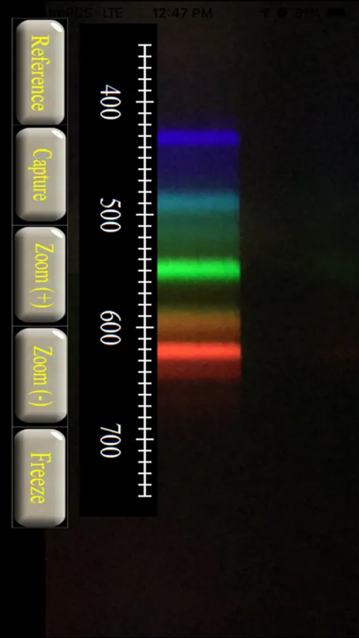 This application is to be used in conjunction with a smartphone spectroscope to view light spectra. The app allows the scope to be calibrated using stored reference spectra, zoom and scaling features. Data can be collected, analyzed and stored.