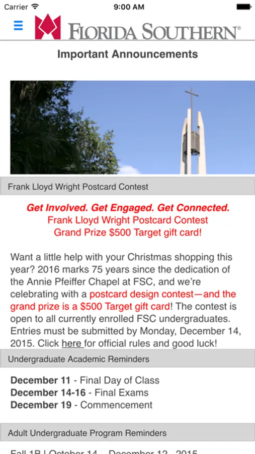 Florida Southern College (FSC) is a comprehensive, selective college offering a superb liberal arts core and outstanding professional programs.