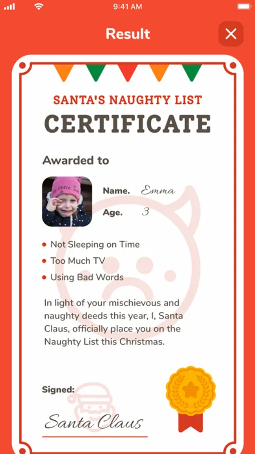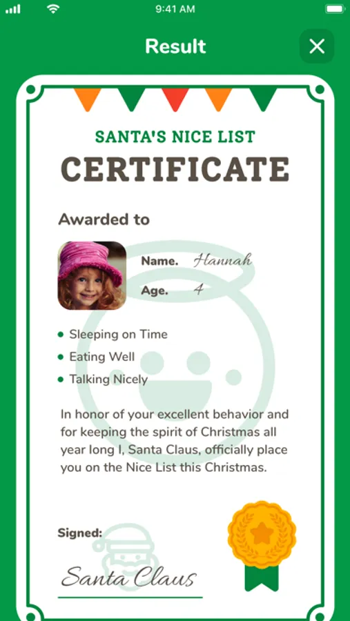 • Save or share your official Santa’s Nice/Naughty Certificates