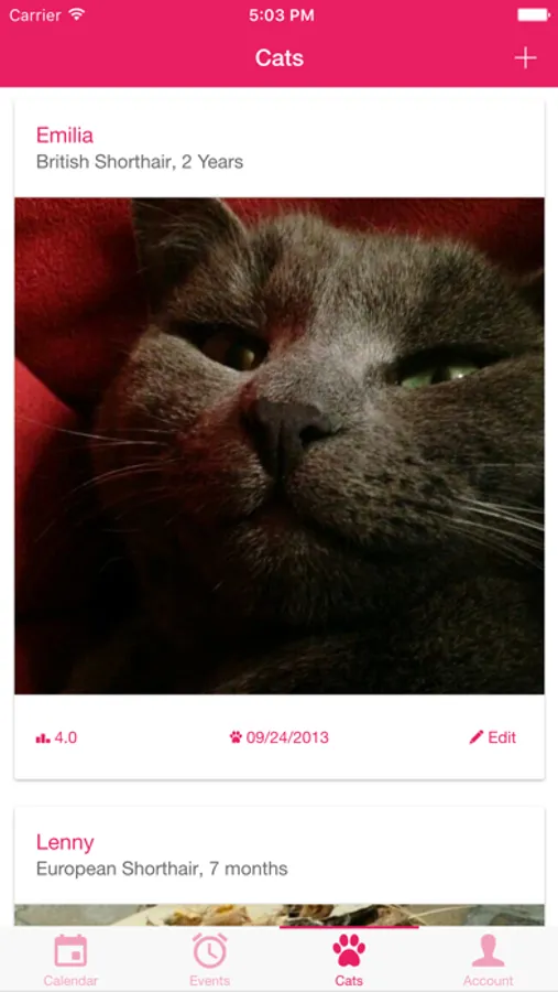 Of course you can manage several cats at the same time with My Cat. Thus, you will never lose track of your pets. A photo can be added quickly and easily.