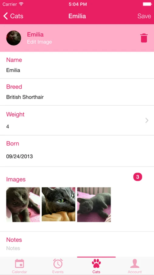 Furthermore, you can set other important data about your cat, such as name, breed, date of birth and the current weight.