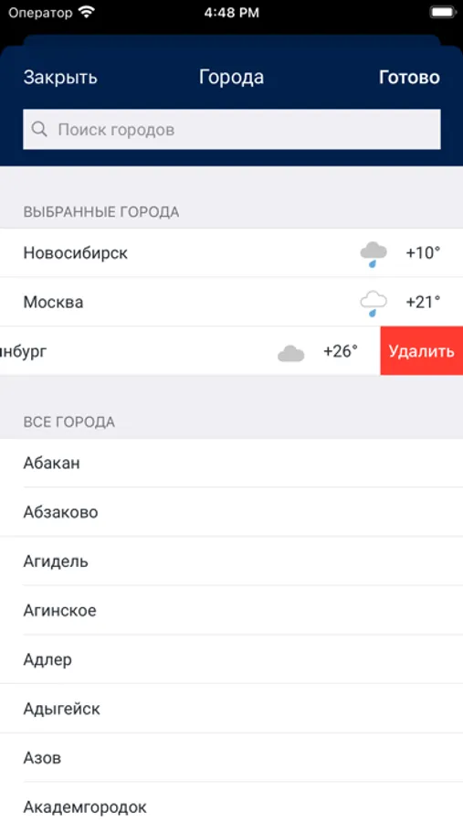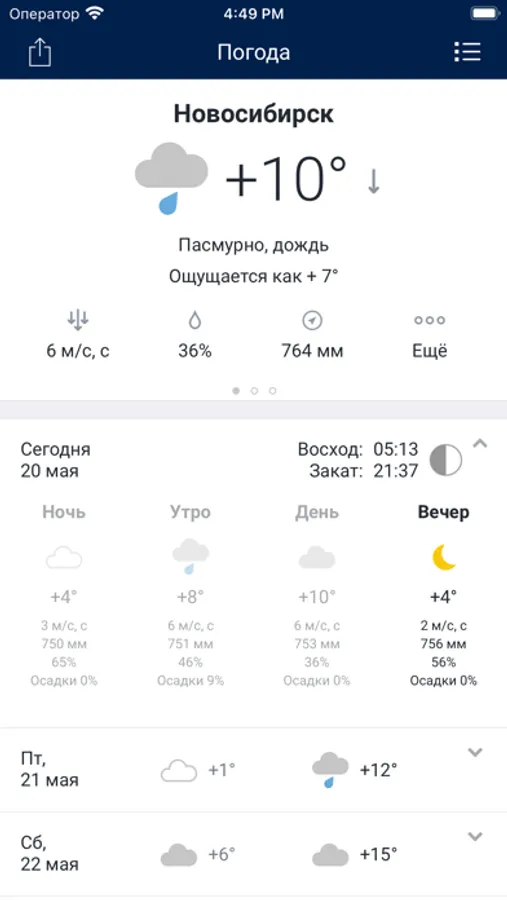 «Погода в городах России» — простое и удобное приложение, позволяющее всегда быть в курсе текущих погодных условий, а также получить точный прогноз погоды на 3-7 дней более чем в 300 городах России.
