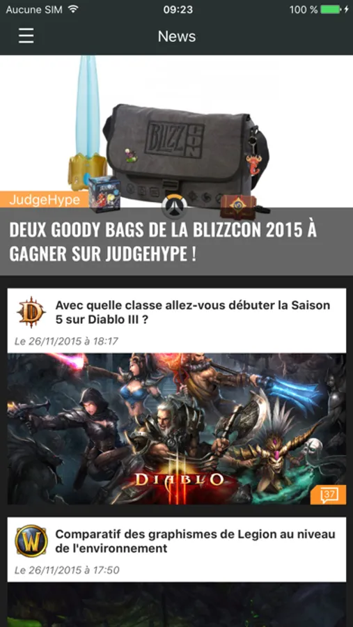 L’application JudgeHype vous permet d’être au courant, en temps réel, de l’actualité des jeux de Blizzard. De World of Warcraft à Diablo III en passant par StarCraft, Overwatch, HearthStone ou encore Heroes of the Storm et le film Warcraft, vous ne manquerez aucune info !