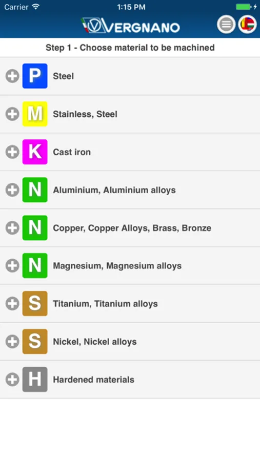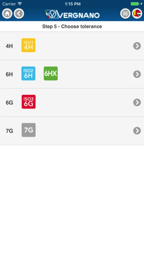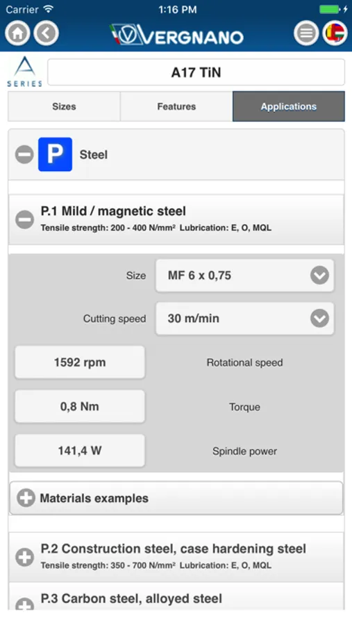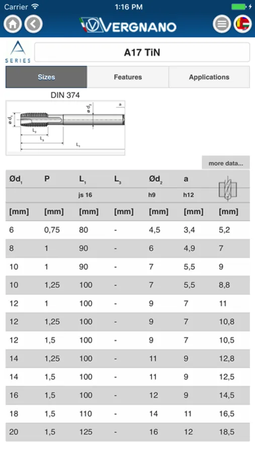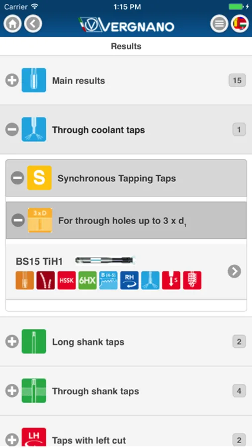 Search for taps in the Vergnano catalogue that better suit threading machining parameters in applications, based on: