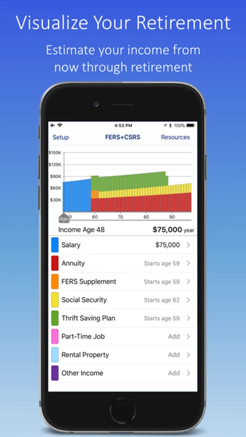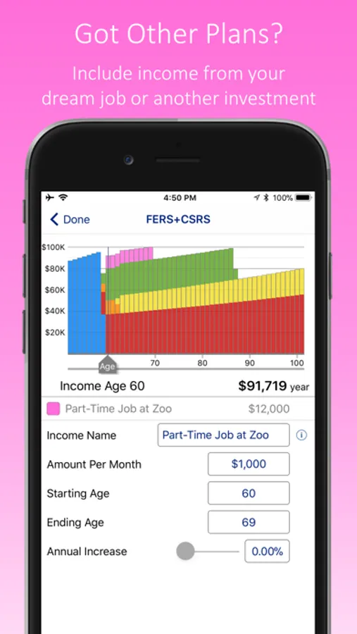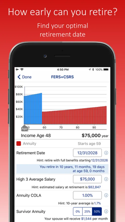 See your income over the next 50 years in a colorful, easy to understand graph. Play with different retirement dates to see how your income is affected. You may be surprised – one user discovered she could afford to retire two years earlier than expected.
