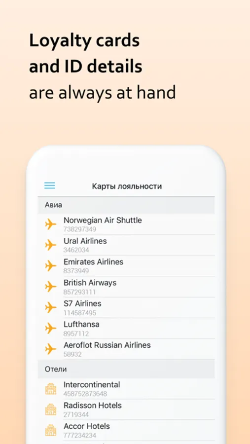 Both duty and personal trips shown as cards. Each card contains all the details on all tickets, hotels and transfers. You can share trips, save additional expenses and sync with your calendar. Loyalty cards are there too.