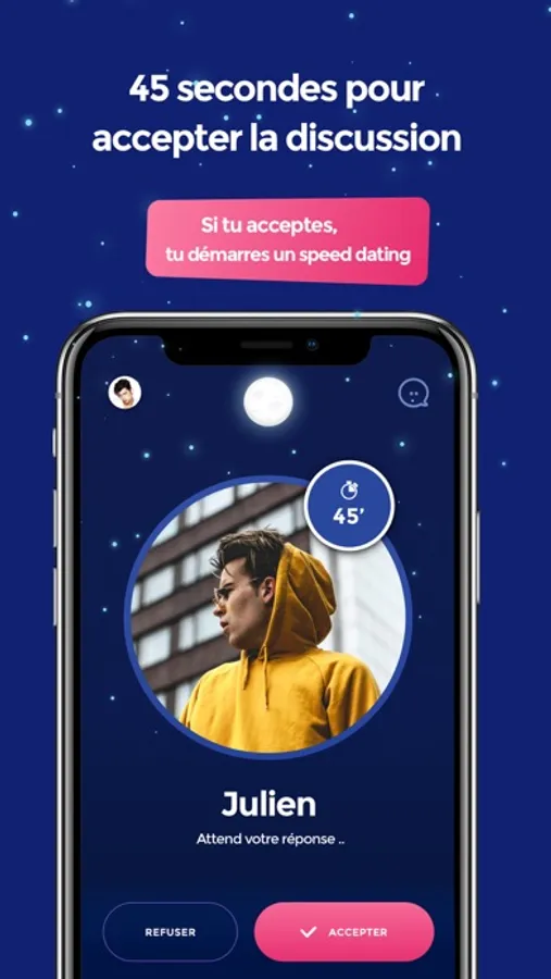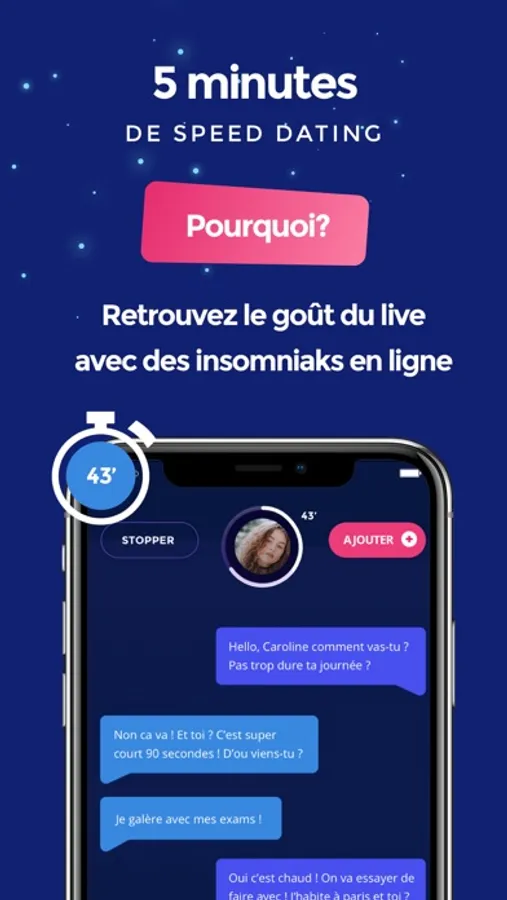 You have 5mn to charm your match and add it in your contacts in order to speak with it every nights. Guaranteed adrenalin !