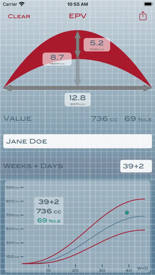 - The volume result is immediately plotted on a sample normative curve, with normal values shown in green and alert values shown in red