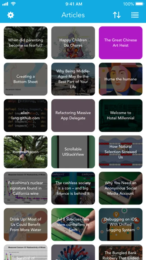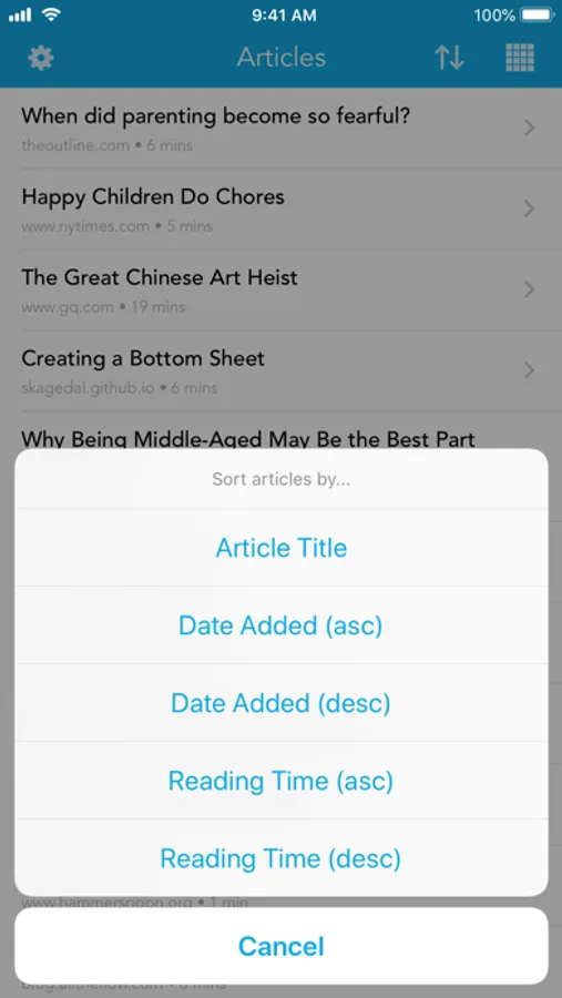 - Swipe an article (in list view) or long press an article (in grid view) to archive or delete it