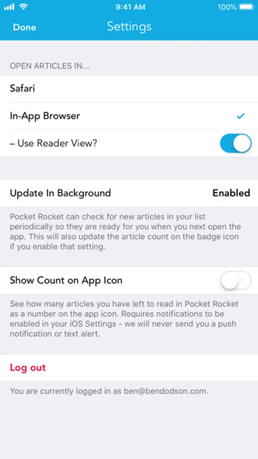 Pocket Rocket is a quick way to view your Pocket articles in Safari. Simply sign into your Pocket account and your list of articles will be displayed; tapping will take you to Safari (or you can choose to use an in-app browser or 3rd party browser if you'd prefer). This makes viewing articles much quicker but the benefit is greatest on iPad where you can run Pocket Rocket side-by-side with your browser for quick reading.