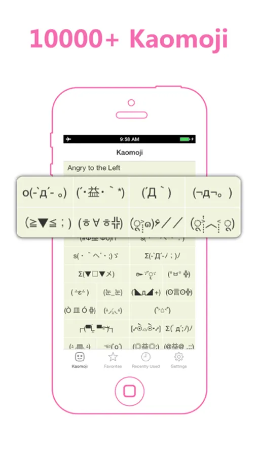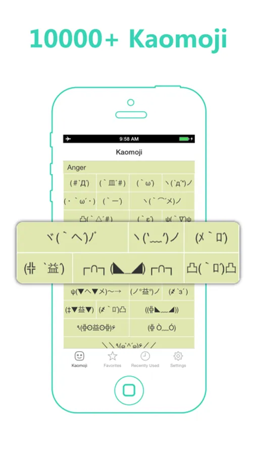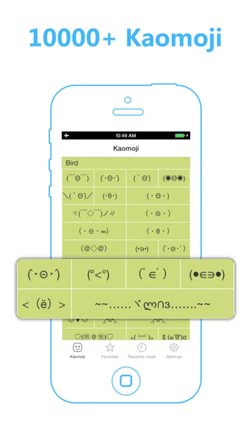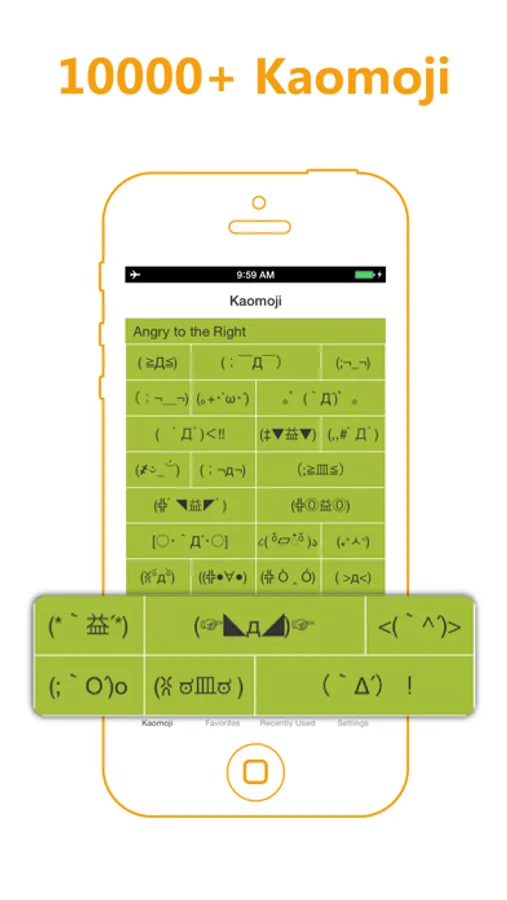 Preview over 10000 different kaomoji and emoji emoticons arranged through 100 different categories and save your favorites in the convenient.