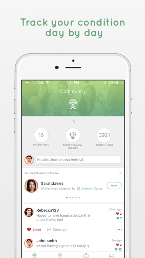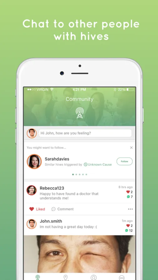 • Chat to other people with hives and swap tips on dealing with itching, redness, pain, swelling and other symptoms
