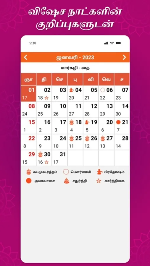 Month View - Provides the details of the month with Festival, Holidays, Tamil suba muhurtham days and Auspicious day indicators.