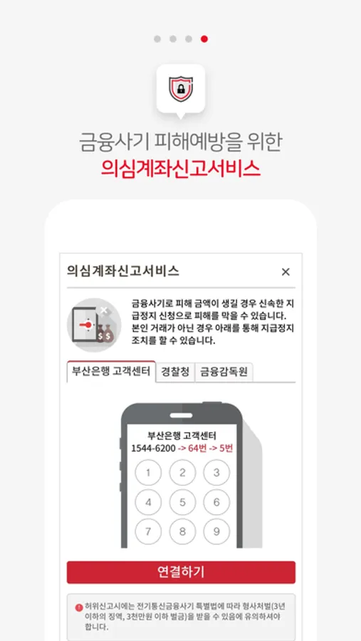 - 은행최초! 의심계좌신고 서비스 제공(금융사기 지급정지 신청 연결 서비스)