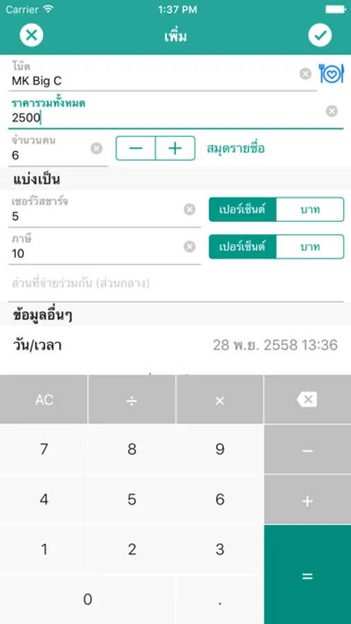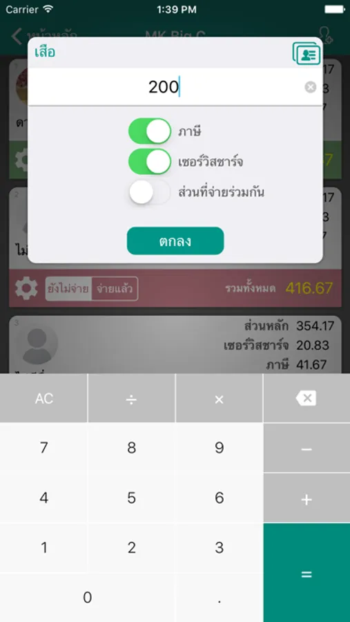 - แยกคำนวณ ภาษี, เซอร์วิสชาร์จ, และส่วนที่จ่ายร่วมกัน ได้