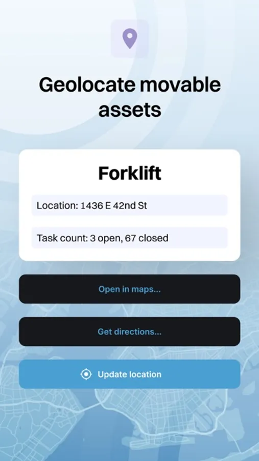 * Record spare part and consumables usage, downtime, and other key work order metrics* Track asset location changes, view assets/tasks by geo-location area, integrated with map apps