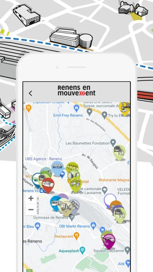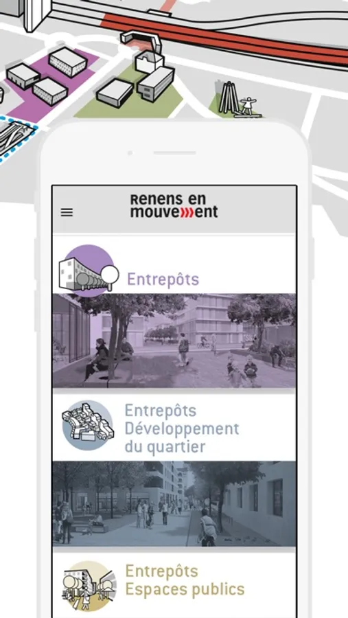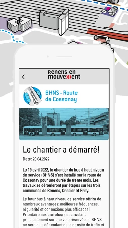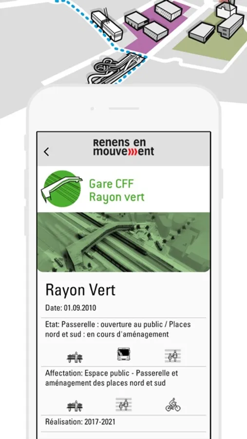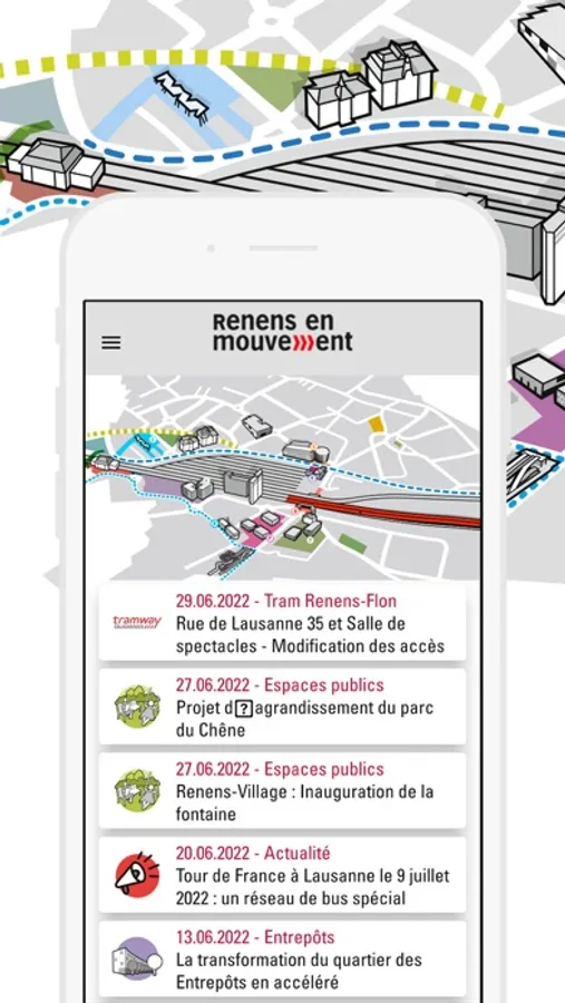 L'application «Renens en mouvement» vous donne accès en tout temps aux pages des chantiers en cours à Renens et aux actualités de ces chantiers.