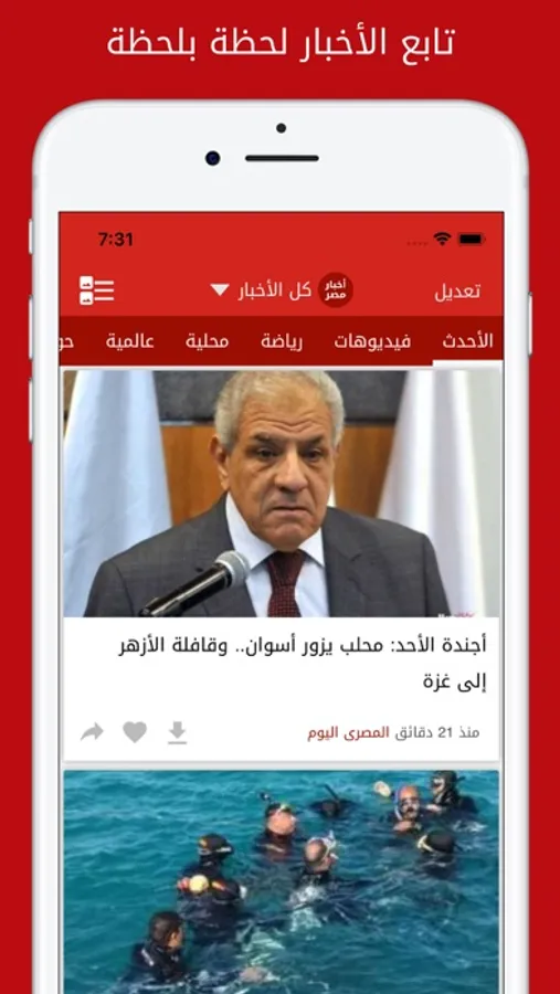 أخبار مصر يتيح لك متابعة الأخبار من مصر و الوطن العربى و كل ما يجرى أول بأول من هاتفك بسهولة و بساطة فى العرض.