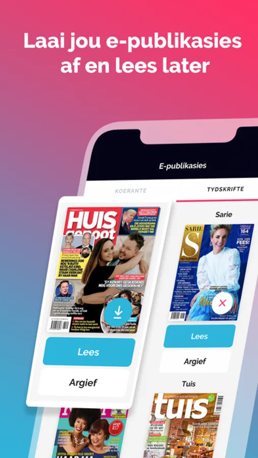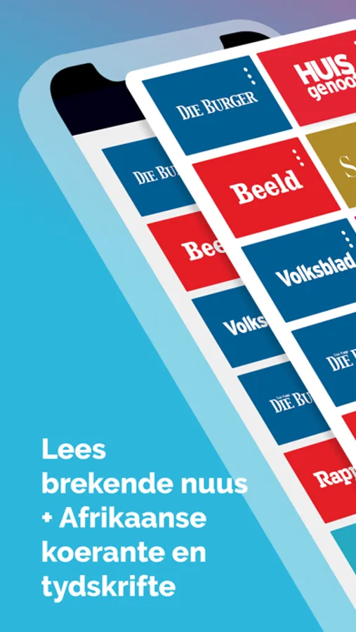 Netwerk24 is die aanlyn-tuiste van voorste Afrikaanse tydskrifte (Huisgenoot, Sarie, Kuier, Tuis, Weg! en Weg Ry & Sleep en Baba & Kleuter) en koerante (Rapport, Beeld, Die Burger en Volksblad, asook tientalle plaaslike koerante) – klik eenvoudig op jou gunsteling se naam om al die artikels te lees of lees dit as ’n e-publikasie wat nes die gedrukte weergawe lyk. In die app kan jy boonop die e-publikasie aflaai wanneer jy internettoegang het en later gerieflik sonder internettoegang lees.