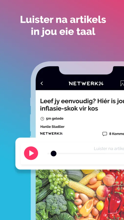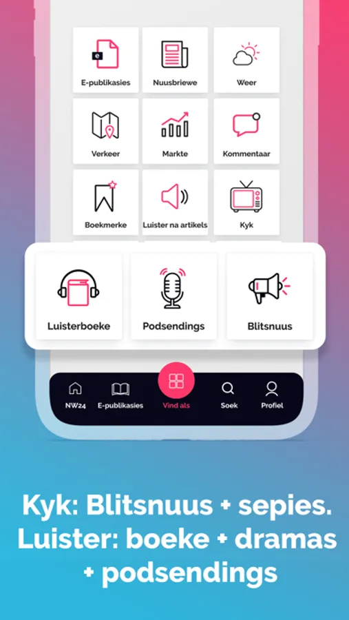 Deesdae hoef jy nie net te lees nie; jy kan na berigte luister terwyl jy met iets anders besig is met ons teks-na-stem-funksie. En moenie van ons luisterboeke, podsenings en video-blitssepies vergeet nie. As ’n intekenaar kan jy boonop dadelik sien hoe die weer en die verkeer in jou omgewing lyk.