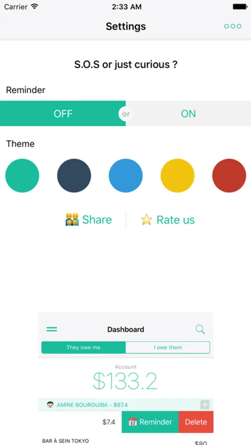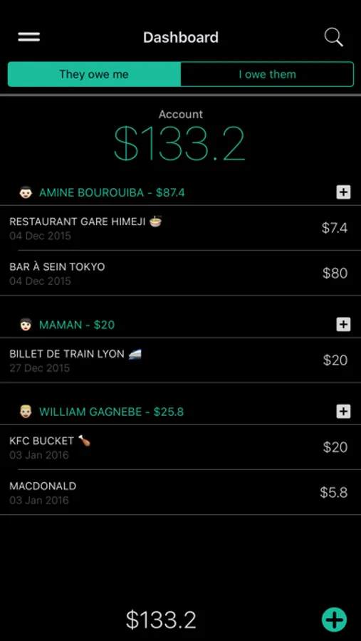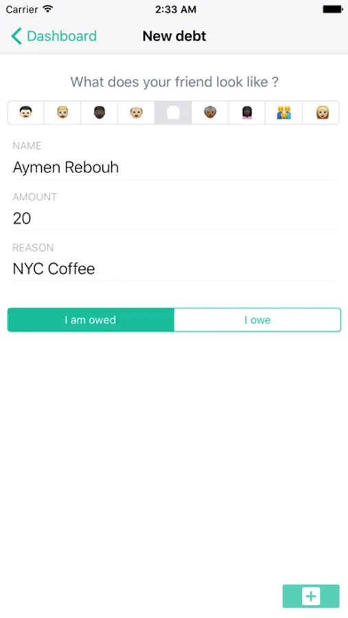 • Add a debt that you owe or that someone owes you ( and represent him with a cool emoji :-] )