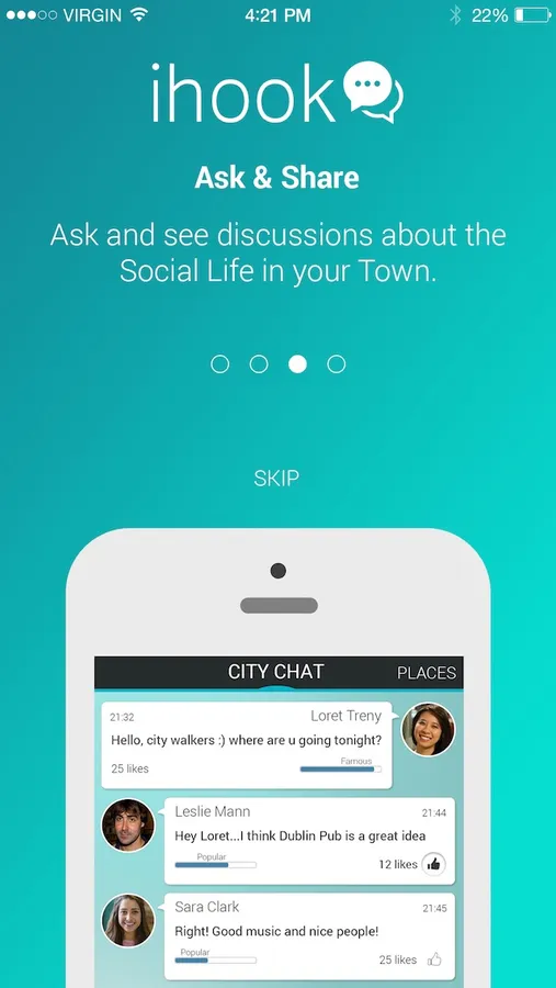 - gives you details about the Social Life in your town on City Chat, and also you can ask&share where and when are things happening. All of this in Real Time!