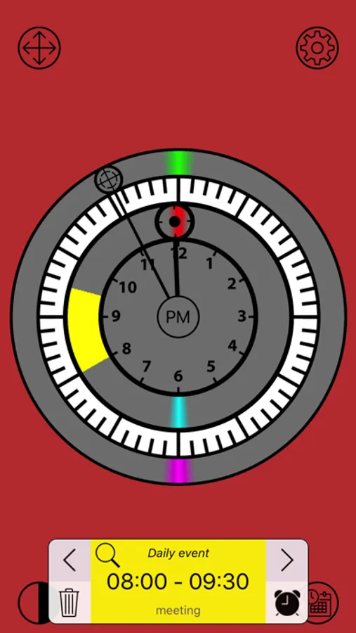 The app offers up to 10 analog clocks to visualize time and events in a colorful and customizable way. Each event has its own color and the space between events can be left gray or appear as a gradient. Clock-faces and -hands can be resized and filled with custom images from the camera or even the web. The app allows for exchanging events with your calendars. Also the setup of the clock can be shared between users via messages or calendars.